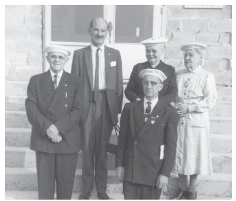De gauche à droite: Louis Even, Bryan Monahan, Gilberte Côté-Mercier, sa mère Mme Rosario Côté, et en avant, Gérard Mercier, devant la Maison Saint-Michel.