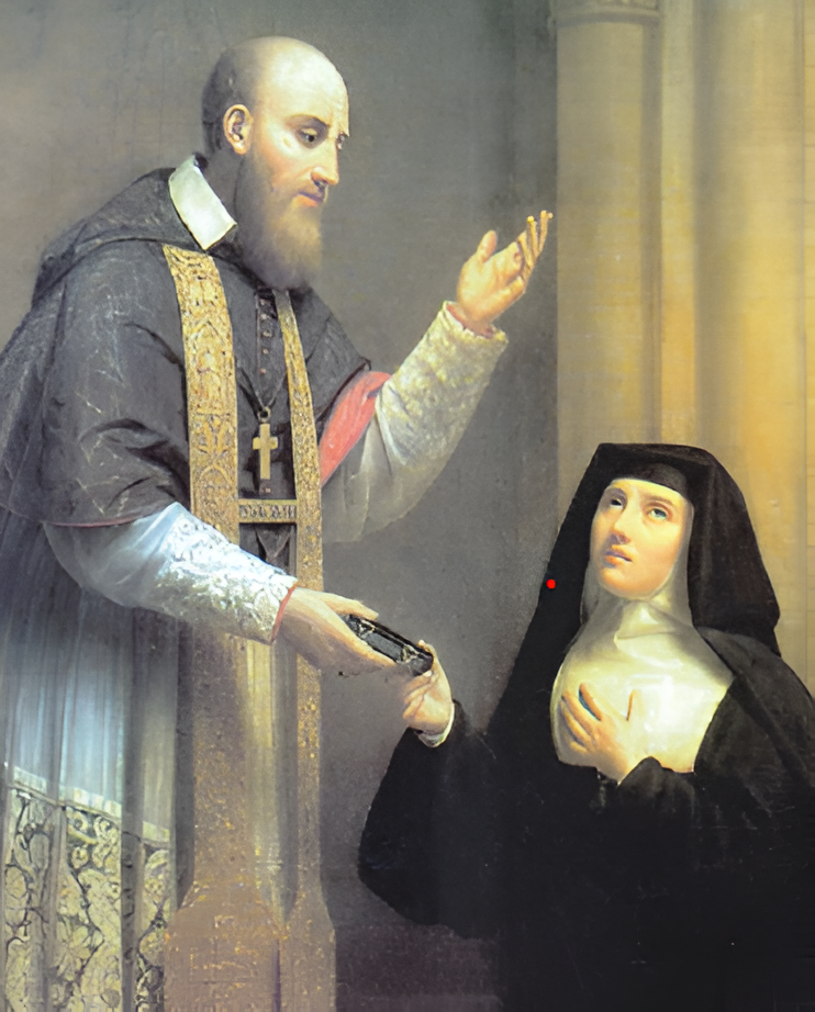 En Mars 1604, l'évêque de Genève se rend à Dijon pour y prêcher le carême. Un matin, après avoir célébré la Messe, le Seigneur lui révèle qu'il fondera un Ordre de religieuses. Lors d'une prédication, il remarque une jeune femme qui porte le costume des veuves et qui l'écoute avec une attention ardente. Jeanne-Françoise de Chantal, dont le mari est mort tragiquement d'un accident de chasse, avait prié le Seigneur de lui donner un guide spirituel, et Dieu lui avait montré François de Sales, qu'elle reconnaît dès qu'elle l'aperçoit en chaire.