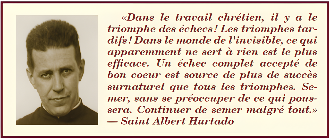 «Dans le travail chrétien, écrit-il, il y a le triomphe des échecs! Les triomphes tardifs! Dans le monde de l'invisible, ce qui apparemment ne sert à rien est le plus efficace. Un échec complet accepté de bon coeur est source de plus de succès surnaturel que tous les triomphes. Semer, sans se préoccuper de ce qui poussera. Continuer de semer malgré tout. Remercier le Seigneur des fruits apostoliques de mes échecs. Quand le Christ parla au jeune homme riche de l'Évangile, Il échoua, mais combien n'en ont pas appris la leçon! Et quand Il annonça l'Eucharistie, combien ne se sont- Ils pas enfuis; mais aussi, combien sont ceux qui ont accouru! Tu travailleras! Ton zèle semblera mort-né, mais combien vivront grâce à toi !»