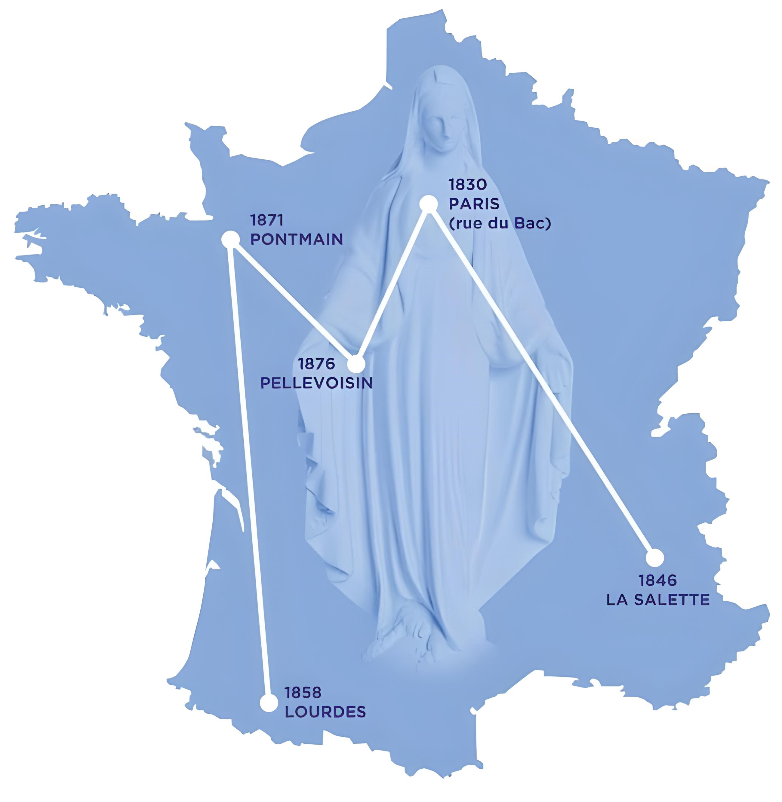 La France, fille aînée de l’Église, a été une terre particulièrement choyée par la sainte Vierge Marie, qui y est apparue cinq fois au 19e siècle, et ces apparitions ont toutes été reconnues officiellement par l’Église : Paris, en 1830, où Marie est apparue à sainte Catherine Labouré à la chapelle de la rue du Bac pour lui révéler la Médaille miraculeuse ; La Salette, en 1846, où Marie est apparue à deux petits bergers, Mélanie Calvat et Maximin Giraud ; Lourdes, en 1858, où Notre-Dame est apparue à sainte Bernadette Soubiroux en déclarant : « Je suis l’Immaculée Conception » ; Pontmain, en 1871 ; Pellevoisin, en 1876. Fait particulier : si on relie les cinq endroits où la Vierge Marie est apparue pendant ce siècle, on obtient la lettre M… pour Marie !