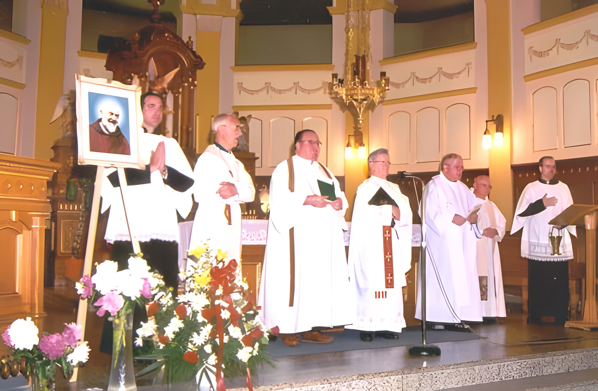 | Cinq prêtres officiaient les funérailles de Mme Côté-Mercier. De gauche à droite: l'abbé Fernand Albert, de Caraquet, au Nouveau-Brunswick; l'abbé Jacques Chaput, curé de la paroisse Saint-Michel de Rougemont; le révérend Père Gérard Montpetit, supérieur des Oblats de Marie Immaculée à Rougemont, et directeur spirituel de madame Côté-Mercier; le révérend Père Edmond Brouillard, o.m.i., aumônier des Pèlerins de saint Michel; le révérend Père Thomas, cistercien, confesseur de Mme Côté-Mercier lorsqu’elle pouvait encore se rendre à l'abbaye cistercienne Notre-Dame de Nazareth à Rougemont. |