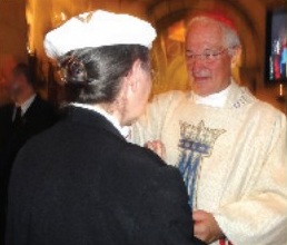Les Pèlerins de saint Michel ont assisté à la messe solennelle célébrée par son Éminence le Cardinal Marc Ouellet, à la Basilique de Ste-Anne de Beaupré, à l’occasion de la cérémonie d’adieu avant son départ pour Rome. Nous voyons ici Mlle Marcelle Caya, missionnaire à plein temps dans l’Oeuvre de Vers Demain, heureuse de recevoir la bénédiction et de remercier son Éminence pour l’influence bénéfique qu’il a exercée auprès des fidèles pendant son mandat de Primat de l’Église du Canada.