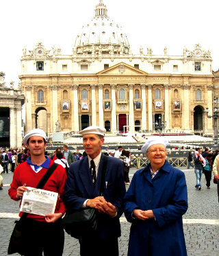 Le 17 octobre, nous sommes arrivés à 6 heures du matin à la porte de la Place St-Pierre, où nous avons pu exercer notre apostolat, car il y avait déjà une grande file de gens qui sont venus pour les canonisations. Nous avons parlé avec des gens de la Nouvelle-Ecosse, de Québec, Ontario, Alberta. Nous avons fait connaître notre journal à beaucoup de gens des autres pays: de l’Australie, l’Italie, l’Espagne, de la Pologne, de la Croatie. Les gens nous ont reconnus par notre béret blanc.