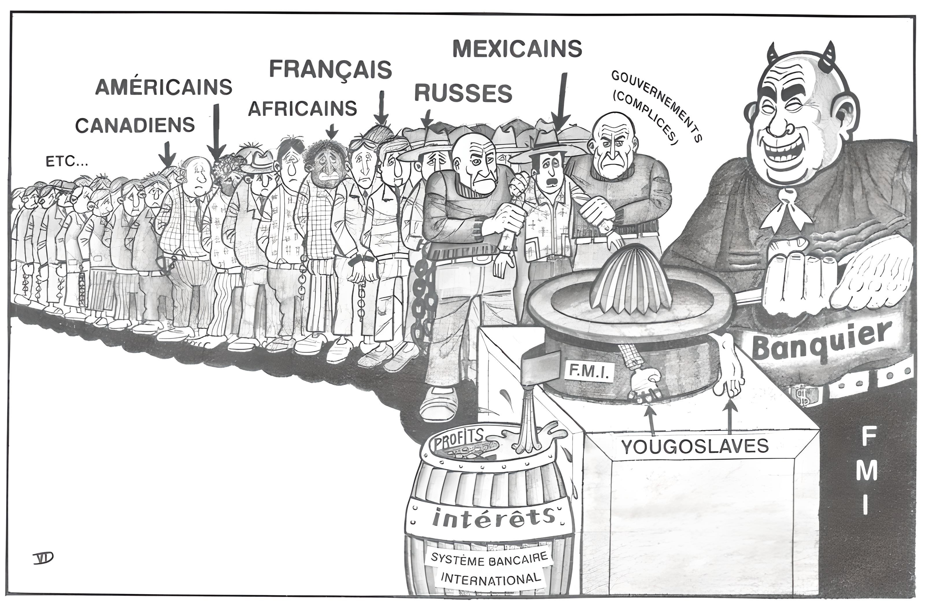 Les créditistes dénoncent cette tyrannie du système d'argent: tyrannie de l'antisocial; tyrannie de l'endettement; tyrannie de la privation devant des produits accumulés; tyrannie de l'embauchage à tout prix pour des choses inutiles ou nuisibles.