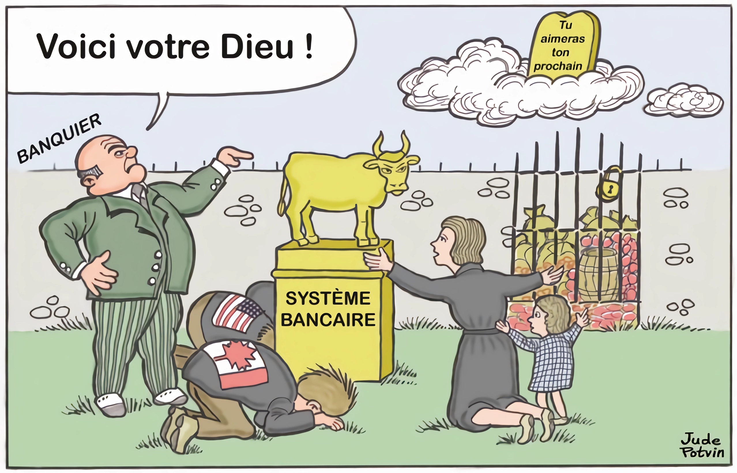 | Le système bancaire actuel est l’équivalent de l’antique veau d’or, il nous rend serviteurs et esclaves de l’argent; le Dividende Social nous rendrait libres et nous donnerait accès à notre héritage des richesses naturelles et du progrès. |