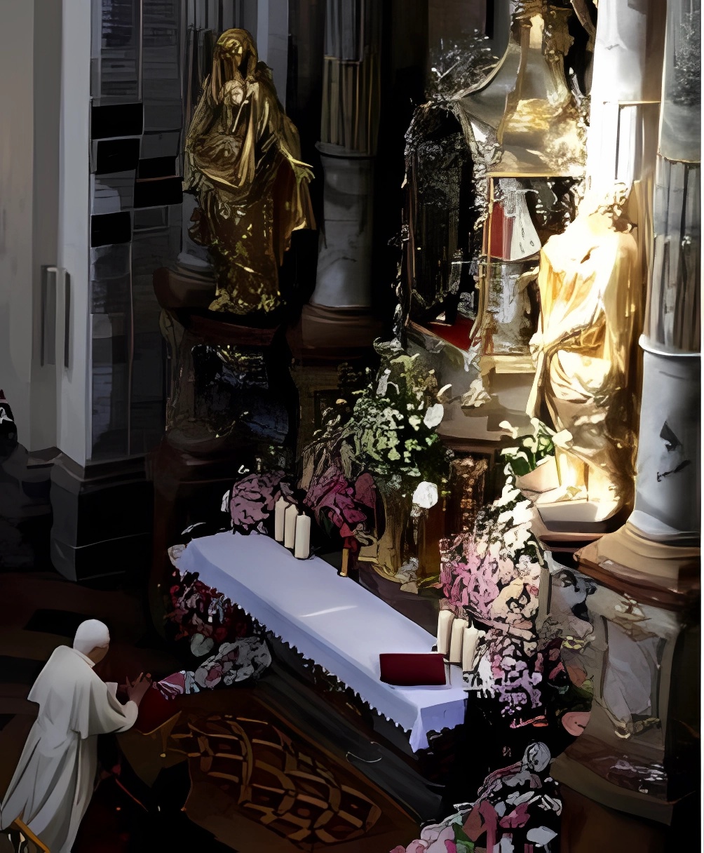 D’avance, le frère Joseph réunit tous les matériaux nécessaires pour faire une statue de cire, et attendit ce jour promis. Lorsque l’Enfant-Jésus revint, le frère était prêt pour réaliser la statue, ayant tous les outils et matériaux nécessaires. Il travailla, moulant et sculptant, jusqu’à ce que la statuette de l’Enfant-Jésus soit complétée. Très satisfait du résultat et de la beauté de son travail, se souriant à lui-même, le frère, épuisé, posa sa tête sur son établi, et ferma ses yeux... C’est dans cette position que les frères le trouvèrent plus tard, avec la belle statuette de l’Enfant-Jésus à côtés de lui. Les anges avaient amené l’âme du bon frère Joseph pour qu’il soit avec son bien-aimé Jésus dans son Royaume céleste. Plus tard cette nuit-là, l’âme du frère Joseph apparut à l’un des frères, et il lui dit :