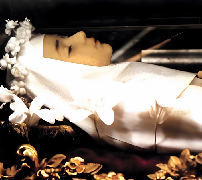Le petit corps miraculeusement incorruptible de la bienheureuse Imelda repose dans un beau reliquaire, dans l'église de saint Sigismondo, à Bologne en Italie.