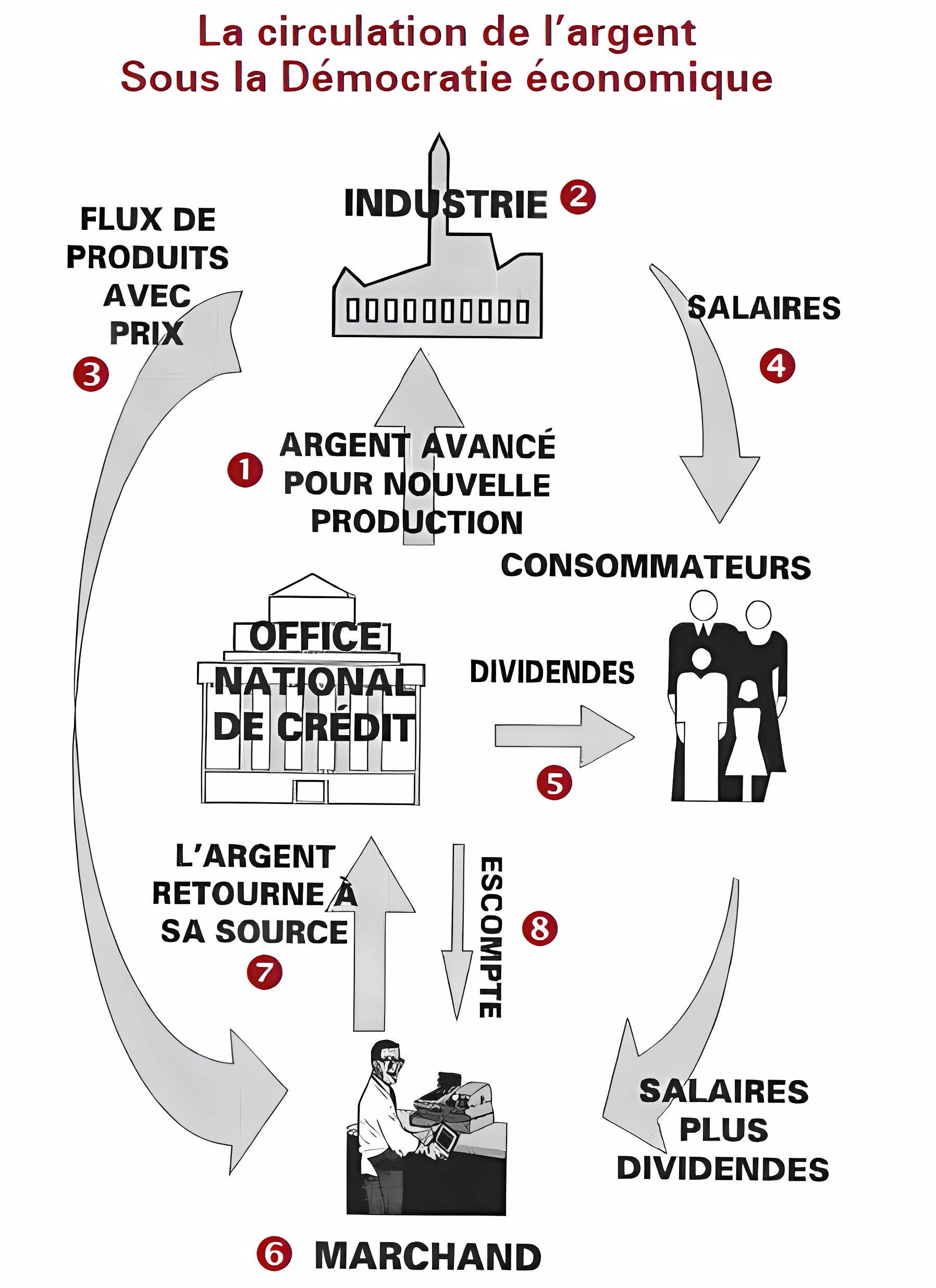 De l’argent est avancé par l’Office National de Crédit (1) au producteur (industrie) (2), pour la production de nouveaux biens, ce qui amène (flèche de gauche) un flux de produits étiquetés avec des prix (3) et des salaires distribués aux employés (4)(flèche de droite). Puisque les salaires ne suffisent pas pour acheter toute la production, l’Office de Crédit comble la différence par l’émission d’un dividende périodique à tous les citoyens (5). La rencontre des consommateurs et des produits se fait chez le marchand (6), et lorsqu’un produit est acheté (consommé), l’argent qui avait été avancé au début de la production de ce produit retourne à sa source (7) , l’Office National de Crédit, qui rembourse au marchand l’escompte (8) qu’il avait accordé au consommateur. L’argent avancé au début a accompli sa fonction, le produit ayant rejoint le consommateur.