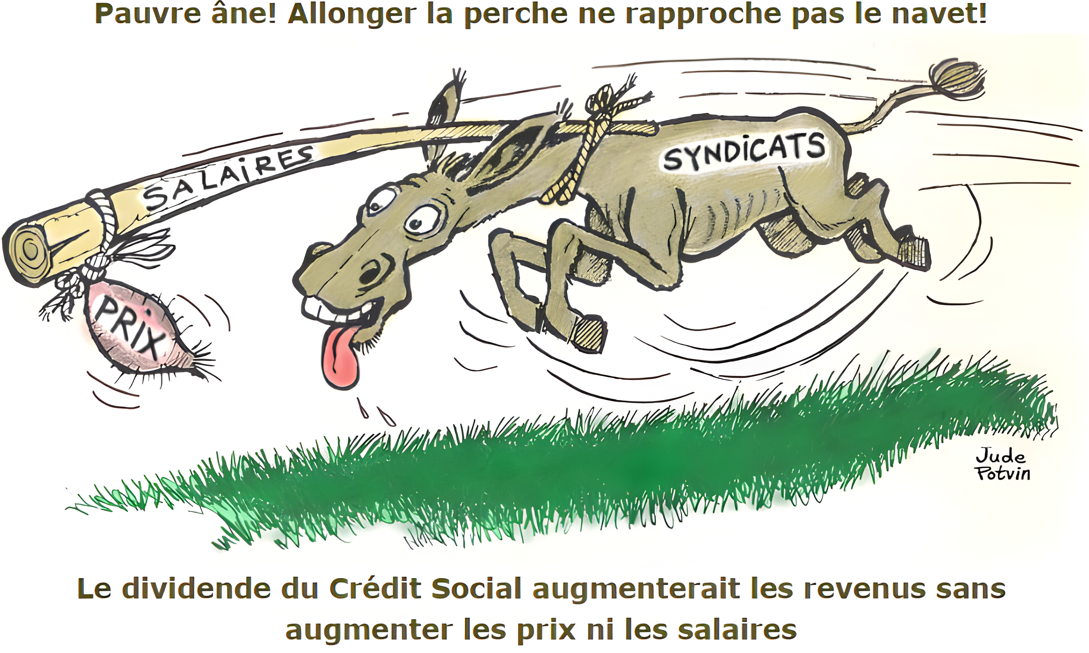 Même si on essaie d’augmenter les salaires pour rattraper les prix, la hausse des salaires sera incluse automatiquement dans les prix, et rien ne sera réglé. (C’est comme l’âne qui court après le navet sur la caricature ci-dessous.) Pour pouvoir acheter toute la production, il faut donc un revenu supplémentaire en dehors des salaires, au moins égal à B. C’est ce que ferait le dividende du crédit social, accordé à chaque mois à chaque citoyen du pays. (Remarquez bien, ce dividende serait financé par de l’argent nouveau créé par la nation, et non pas par les taxes des contribuables, car ce serait alors de l’argent provenant des salaires.)