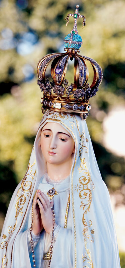 Photo: La statue pèlerine de Notre-Dame de Fatima. Tout le monde sait que le Bienheureux Pape Jean-Paul II avait remis à l’évêque de Leiria le projectile qui l’a frappé lors de l’attentat contre lui sur la Place Saint-Pierre en 1981. L’évêque de Leiria l’a fait ajouter à la couronne de la statue de la Vierge Marie. Jean-Paul II disait tendrement: «Une main maternelle a guidé la trajectoire du projectile». On distingue très bien la balle fixée à l’intérieur en haut au centre de la couronne.