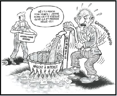Au Canada, le gouvernement a cédé à un monopole privé le pouvoir de frapper de la monnaie. Voici ce qu’il en est résulté: pour avoir emprunté 39 milliards $ pour les services à la population des différents ministères, la dette a atteint 562 milliards $, à cause de l’intérêt composé, accumulé d’année en année. 93% de la dette fédérale est maintenant attribuable aux intérêts composés et accumulés. 7%, c’est le budget des différents ministères, le budget national. Si on avait à payer seulement les services qu’on reçoit de l’État, ce serait une bagatelle ! Il y a eu des années où nous avons payéoù nous avons payé 42 milliards $ d’intérêts pour avoir obtenu 39 milliards $. C’est un bon commerce n’est-ce pas ? C’est à peu près l’entreprise la plus prospère de nos jours.