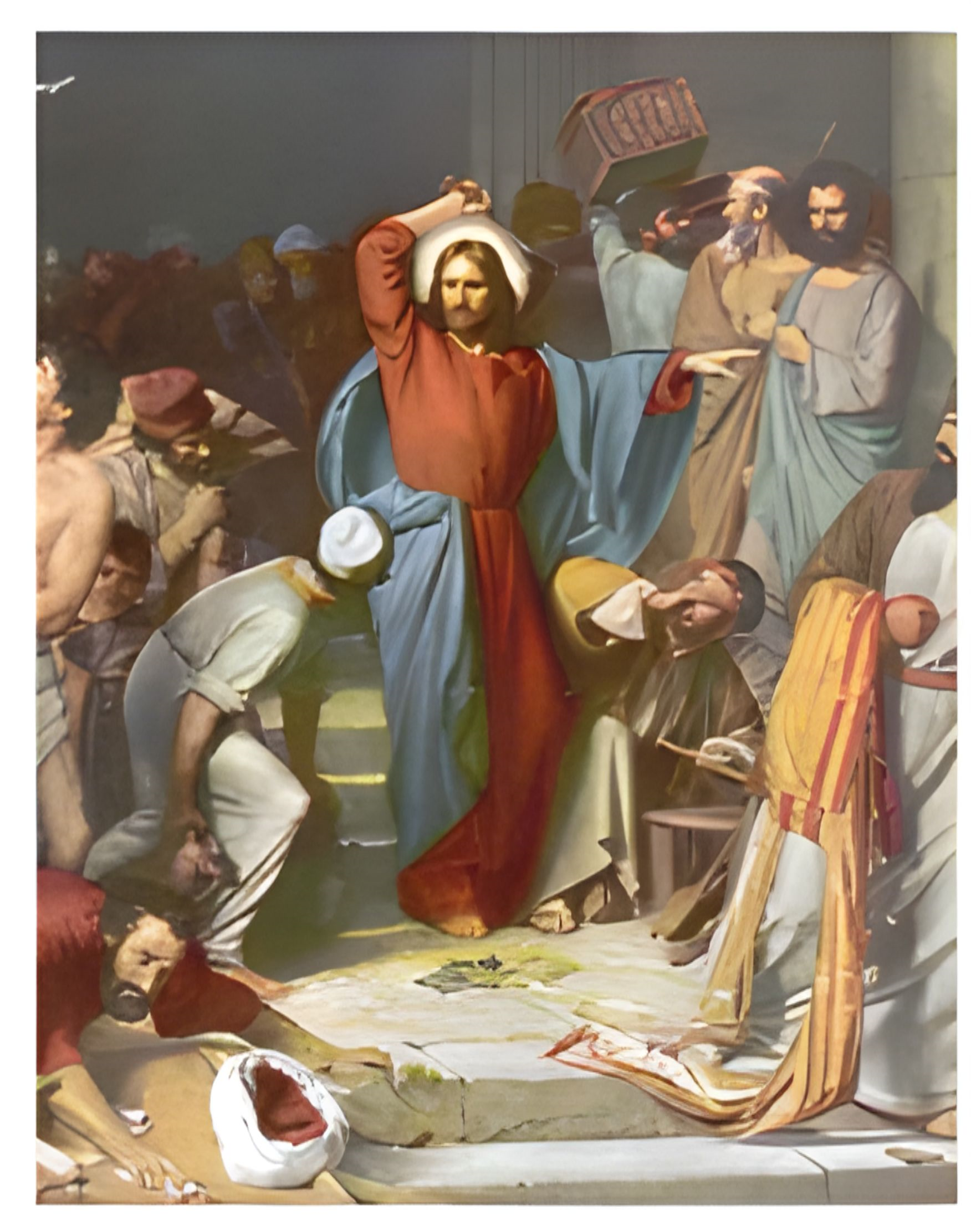 Il existait en ce temps-là une loi qui stipulait que la dîme ou taxe au temple de Jérusalem devait être payée par une pièce de monnaie spéciale, appelée «demi-shekel du sanctuaire», dont les changeurs d'argent s'étaient justement arrangés pour obtenir le monopole. Il y avait plusieurs sortes de pièces en ce temps-là, mais les gens devaient obtenir cette pièce spécifique pour payer leur dîme. De plus, les colombes et les animaux que les gens devaient acheter pour offrir en sacrifice ne pouvaient être achetés autrement que par cette monnaie, que les changeurs d'argent échangeaient aux pèlerins, mais moyennant de deux à trois fois sa valeur réelle en temps normal. Jésus renversa leur table et leur dit: «Ma maison est une maison de prière, et vous en avez fait une caverne de voleurs.»