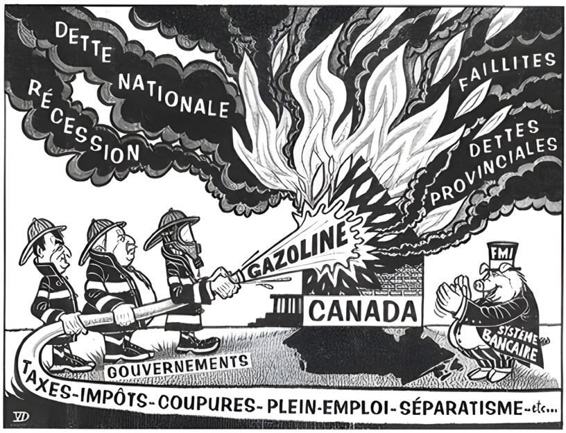 Certains diront que si on ne veut pas s'endetter, on n'a qu'à ne pas emprunter. Mais comme on l'a vu précédemment, si personne n'empruntait d'argent de la banque, il n'y aurait tout simplement pas un sou en circulation, puisque tout l'argent est créé par les banques sous forme de prêt. Seulement pour maintenir le même niveau d'argent en circulation, il faut s'endetter à perpétuité. D'ailleurs, il n'existe même pas assez d'argent dans la pays pour payer la dette fédérale... sans tenir comptes des dettes des provinces, des compagnies, et des consommateurs!
