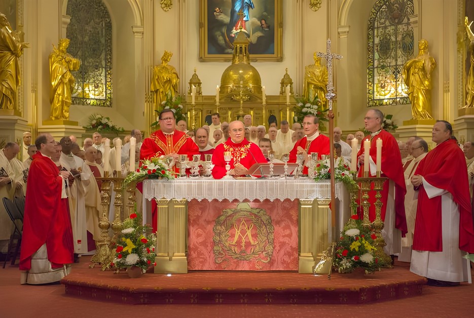 | Le cardinal Ortega (au centre) célèbre la messe dans la Basilique Notre-Dame de Québec, entouré du cardinal Lacroix, de Mgr Luigi Bonazzi, nonce apostolique au Canada, Mgr Paul-André Durocher, président de la Conférence des Évêques catholiques du Canada, et Mgr Denis Bélanger, curé de la cathédrale de Québec. |