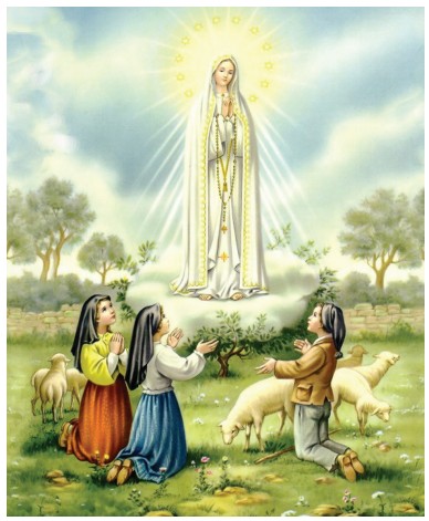 Du 13 Mai au 13 Octobre 1917, Marie est apparue à trois petits enfants, Jacinthe et François Marto, et leur cousine Lucie dos Santos. Jacinthe, décédée le 20 Février 1920 à l'âge de 9 ans, et François, décédé le 4 avril 1919 à l'âge de 10 ans, ont été canonisés par le Pape François le 13 mai 2017, cent ans exactement après la première apparition de Notre-Dame. Lucie est décédée le 13 Février 2005, à l'âge de 97 ans ; son procès de béatification est en cours.