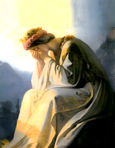 La Dame alors se lève. Les bras à demi croisés sur sa poitrine, elle regarde les deux bergers avec douceur. Mais elle est en larmes. Des larmes qui tombent comme des gouttes de lumière, car elle est toute en lumière. Elle porte des vêtements qui sont de lumière, même si leurs formes ressemblent à celles des vêtements connus; que les enfants appelleront bonnet, fichu, robe, tablier, chaussures – mots bien creux, diront-ils plus tard, pour exprimer des formes qui, dans leurs plis les plus prononcés, ne présentaient aucune ombre. Un visage très blanc, tout de beauté. La Dame pleure, sans sangloter. Elle rassure tout, de suite les deux bergers: «Avancez, mes enfants. N'ayez pas peur. Je suis ici pour vous annoncer une grande nouvelle.»