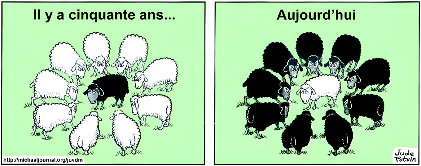 Le mouton noir d'une famille ou d'un groupe, c'est celui qui n'agit pas correctement, qui n'agit pas comme les autres. Il y a cinquante ans, ceux qui donnaient le mauvais exemple et menaient une vie de péché en public étaient considérés comme des moutons noirs, et se faisaient regarder de travers par le reste de la société. Mais depuis cinquante ans, les choses ont changé du tout au tout. Aujourd'hui, la société est complètement bouleversée, et on se retrouve avec la situation contraire: ce sont ceux qui veulent rester de bons catholiques qui se font regarder de travers et appeler les «moutons noirs».